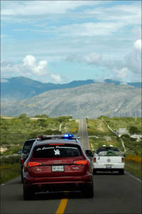 Ein schwarzes Band Asphalt zieht sich durch eine staubige Hochebene. Die Temperatur beträgt geschätzte 70 Grad, wahrscheinlich sind es 38 im Schatten. Über der Straße flimmert die Luft, irgendwo regt sich ein unverschämter Vogel. Es ist ruhig an diesem Vormittag Ende Oktober. Rechts eine nicht enden wollende Reihe von Kakteen, im Dunst dahinter eine Bergkette. Links hinter einem kleinen Staubwirbel eine Ansammlung von Hütten, eine verlassene Tankstelle.