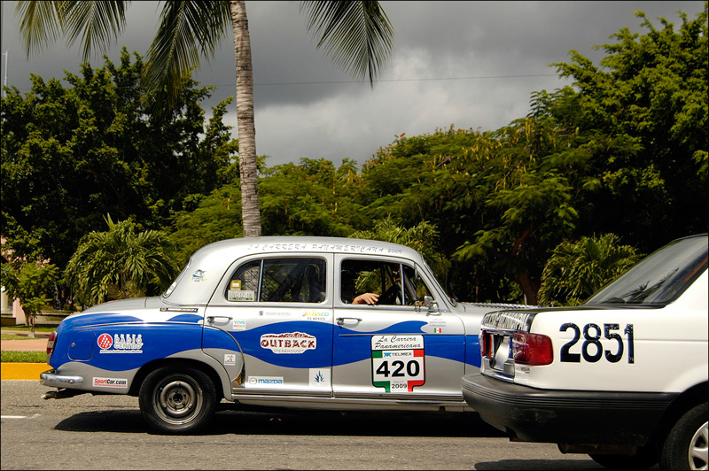Das Rennfeld wird längst nicht mehr dominiert von amerikanischen Autos, die Europäer sind in diesem Jahr mit einer Horde Porsche und Mercedes-Benz vertreten. Vereinzelte Exoten. Ein Saab 96, der Knuffel, der so böse knurren kann. Heiseres, unheimlich schnell anmutendes Brüllen und Fauchen eines Opel Diplomat (von Wangenheim / Hambloch). Volvo PV444, alte Hülle, modernste Innereien (Mats Hammarland Racing hat die im Verleih). Das schnellste Taxi Mexikos in diesen Tagen, die Alfa Guilia von Martin Lauber, der rote Blitz (Heusel / Hauser).