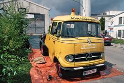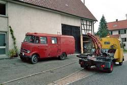 Sein arbeitsreiches Leben begann der L 406, ganz ähnlich wie Edeka, sein berühmter Bruder, der schon seit Jahren im Clubdienst steht, im Jahre 1966 als Pritsche für eine Baustoffhandlung in Konstanz. Fünf Jahre später übernahm das Abschleppunternehmen Knöpfle den Wagen um ihn zu einem Abschleppwagen umzubauen. Dazu wurde ein damals hochmoderner Bergekran und eine Abschleppbrille bei der Firma Bilstein bestellt und, wie es scheint, in Eigenregie auf den Rahmen aufgeschraubt. Im Brief ist jedenfalls der Hersteller „Bilstein-Knöpfle“ vermerkt. Da irgendwie alles wie Eigenbau aussieht, lässt sich nur schwer nachvollziehen, wer für welche Modifikation verantwortlich zeichnete. Bei der Materialauswahl und –dimensionierung jedenfalls erkennt man die Prämisse, auf keinen Fall zu sparsam zu sein, wenn es stabil werden soll. Der gesamte Heckaufbau ist aus etwa 5 mm dickem Blech zusammengeschweißt, der eigentlich nicht wirklich schwach konstruierte Rahmen von Mercedes an zahlreichen Stellen mit aufgeschweißten Blechen verstärkt. Damit das Ganze dann nicht nach hinten umkippt, vor allem, wenn das erlaubte Gewicht des zu bergenden Fahrzeugs von 1200 kg voll ausgereizt ist, ersetzt eine Kastenstoßstange das zierliche und eigentlich elegante Originalteil. Innen an der Stoßstange sind an mehreren Stellen dicke Stahlplattenpakete eingeschweißt, sie dürfte alleine schon so viel wiegen wie ein nackter Golf 1. Ohne jetzt auf eine Waage gefahren zu sein, schätze ich, dass das Leergewicht nicht allzu weit vom zulässigen Gesamtgewicht von 3900 kg entfernt sein. Schon leer vermisst der Wagen mit seinen 55 schmächtigen Dieselpferdchen ein wenig an Fahrdynamik, wie sich das mit aufgeladenem Unfallwagen anfühlt, das möchte ich mir nur vorstellen müssen. Was gefällt, ist der elektrische Antrieb für Bergekran oder Hubbrille, jedoch bedarf der Windenmotor noch einer Revision. Zum Zubehör gehört eine Stange mit Zusatzrücklichtern und –blinkern, so dass auch elektrisch tote Autos sicher geschleppt werden können sowie zwei Dollies, die man unter nicht rollfähige Räder schnallen kann. In der Werkzeugkiste sowie im Holzaufbau in der Mitte finden sich noch allerlei Ketten, Stahlseile, Brechstangen und anders nützliches Werkzeug.