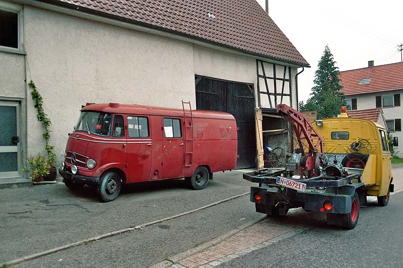 Eigentlich sah die weitere Planung vor, dass ich fünf Tage später zusammen mit einem eine KFZ-Werkstatt besitzenden und daher mit Altblech nicht unerfahrenen Freund zur Besichtigung fahre. Wie das aber so ist, wenn einen der Altblechvirus befallen hat, überkam mich der Drang, das Ding zu sehen, schon früher und schon am nächsten Nachmittag machte ich mich auf den Weg. Dass das am Freitag Nachmittag bedeutet, zusammen mit vielen anderen sich auf den Weg zu machen, die zwar nicht das gleiche Ziel, aber die gleiche Autobahn wählten, hatte zur Folge, dass wir alle zusammen in 17 km Stau und zähfließendem Verkehr uns durch das Kreuz Stuttgart und die A 81 bis hinter Ehningen wälzten. Die anschließende Ausnutzung der maximal möglichen Geschwindigkeit (sowohl legal, als auch technisch...) brachte mich trotzdem um Punkt 17 Uhr zum verabredetem Treffpunkt in ein Konstanzer Industriegebiet. Nach etwas Gekurve durch immer obskurere Gassen (ich weiß jetzt, wo Konstanz sein Rotlichbezirkle hat) stand ich vor ihm: Knöpfle, ein in die Jahre gekommener, erfahrener, aber noch nicht rettungslos zerschundener Abschleppwagen. Was für ihn sprach: Er startete sofort, der Motor lief rund, er bremste, alle Lampen leuchteten, er ist vollständig. Was gegen ihn sprach: Mittelstarker Rostbefall am Rahmen mit zwei oder drei klitzekleinen, handtellergroßen Durchrostungen. Die Worte eines Clubkollegen im Ohr, man könne einen Mercedes immer wieder zusammenschweißen, wenn man nur will, beschloss ich, diese Löcher in der Bewertung nicht zu sehr zu gewichten, sondern mich eher darüber zu freuen, dass die Blattfedern, die Achsschenkel und alle weiteren Abschmierstellen sehr gut im Fett standen. Auch liefen jetzt direkt keine Flüssigkeiten aus und der Kühler war praktisch neu.